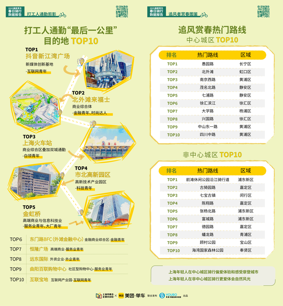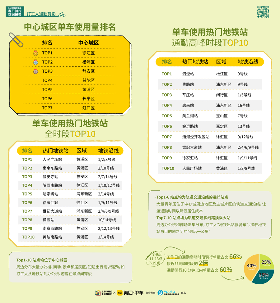 日前,上海市青少年研究中心、美团单车联合发布《2025魔都青年春日骑行数据报告》。该报告基于美团单车2025年3月1日至3月20日订单数据,分析了职业青年工作通勤和年轻人双休日出游场景的特点。