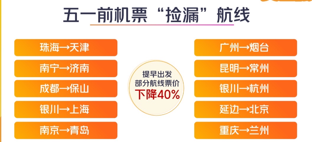提前错峰出游,实惠多多。数据显示,“五一”前夕,国内部分航线票价较去年同期下降40%左右。