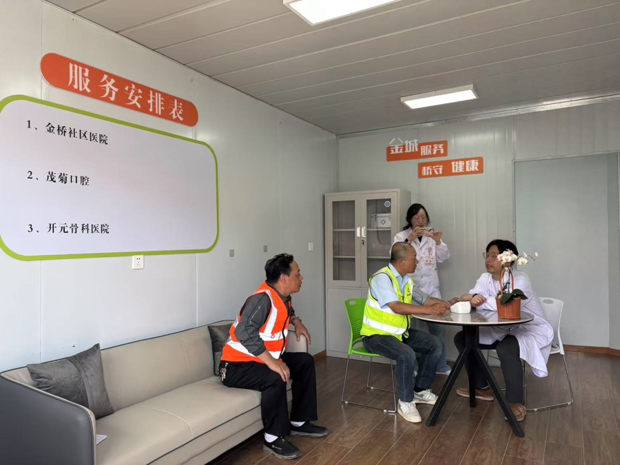 2025年,金桥镇城建联盟大力探索大型工地建设综合型服务驿站,通过党建引领统筹公益资源,为一线建设者提供集成式、综合性服务,不仅提高了服务效能,更形成了可复制推广的模式。金桥邮政支局是城建联盟的新成员,他们在工地建起了邮件快递收储站点,一线建设者们不出工地就能享受便捷的快递收发服务。联盟老成员金桥卫生服务中心则定期派医生坐诊,为建设者们提供日常医疗服务。
