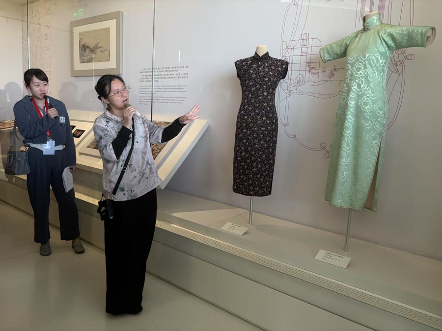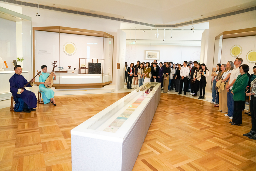 在江南造物馆,旗袍、香具、服饰等古代文物与评弹、昆曲表演相映成趣,既呈现江南文人雅士的生活意趣,也彰显了传统艺术与现代审美的交融。上海博物馆研究员于颖站在张信哲捐赠的黑地织金印花绸旗袍和湖绿地银白色花卉纹绸旗袍前,把海派旗袍的特点娓娓道来。一曲昆曲《桃花扇》之后,于颖讲述了明朝满地黄梅朵花纹丝布夹袍的特点。在绘画馆,董源《夏山图卷》前,上海博物馆书画部主任凌利中向观众普及了这幅作品中体现的中国绘画的写意特点:“江南的水汽氤氲在画家笔下的点点块块中,虽然是墨色,但依然能感觉到树木的郁郁葱葱”。钱选《浮玉山居图卷》、宋徽宗的《柳雁乳鸭图》等名作,与现场的琴箫合奏、琵琶三弦相和,诠释“外师造化,中得心源”的东方哲思,给予不同文化背景的观众一把理解中国艺术的钥匙。在屋顶花园,则以茶会友,以乐传情,让江南丝竹的韵律与春日的花香共同编织一段跨越时空的文化记忆。