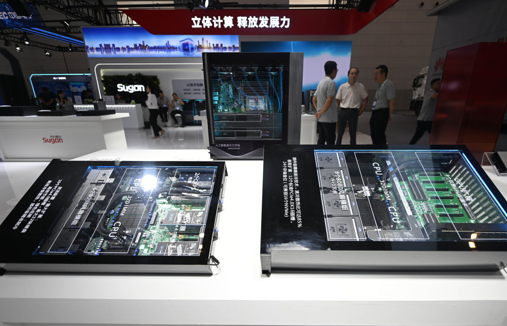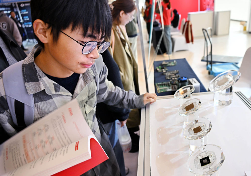 2024年11月2日,与会者在2024中国自动化大会展览区观看国产芯片。当日,2024中国自动化大会在山东省青岛市开幕。大会以“新质发展智控未来”为主题,聚焦自动化与人工智能深度融合,探讨新产业、新技术的创新发展。