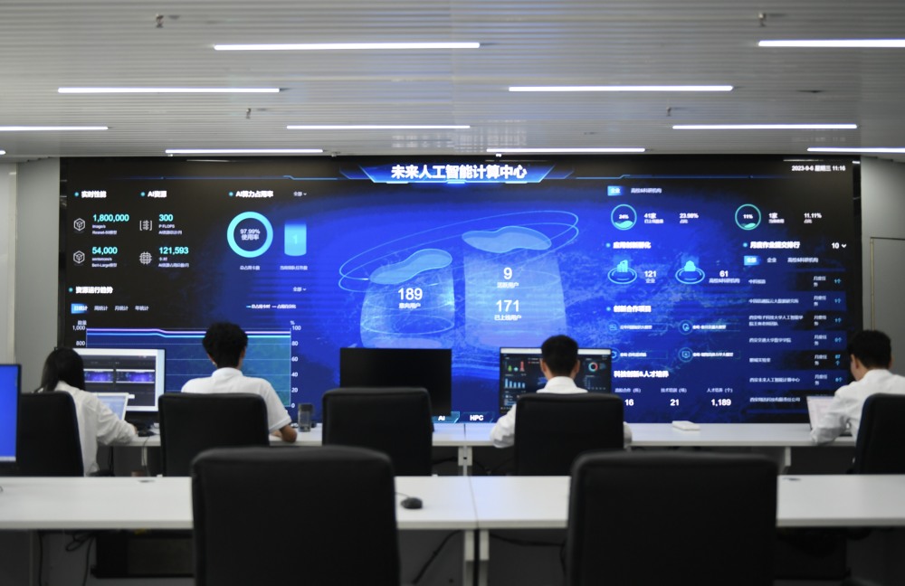 2023年9月6日,在陕西西安的未来人工智能计算中心监控运维室,工作人员通过智慧大屏监测平台运行情况。