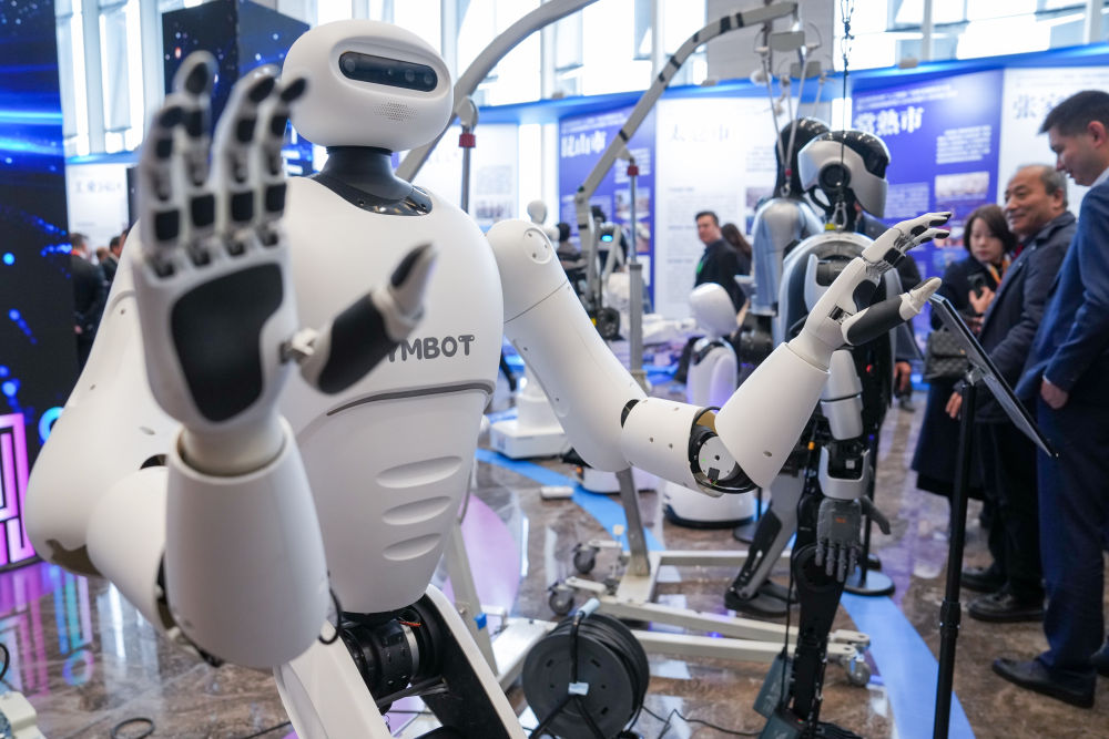 2025年2月14日,在2025年苏州市“人工智能+”创新发展推进大会暨人工智能赋能新型工业化深度行(苏州站)活动现场拍摄的人形机器人。