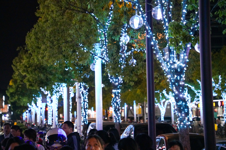 随着通阳路亮灯后,好多市民朋友都忍不住停下脚步拍照打卡。“这个灯装了以后街道都变漂亮了不少!”60多岁的老街坊王老伯举着手机连按快门与家人分享着。年轻父母推着婴儿车在裸眼3D球前停留:“宝宝快看,树上的球球里有海底世界哦!”