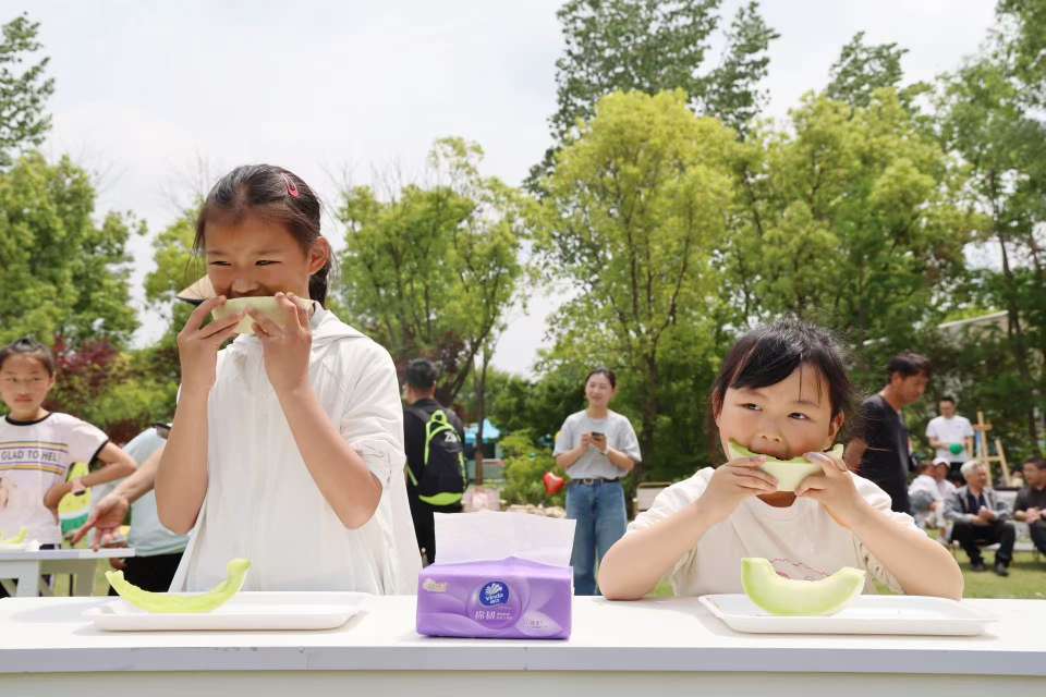 离音乐节不远的芳香小镇商业街上,西甜瓜嘉年华同样热火朝天。品鉴区内,朱泾镇农业拳头产品“珠丰”甜瓜和金山小皇冠被切片摆盘,清甜的汁水顺着案板流淌,游客排起长队争相试吃。“皮薄肉脆,口感甜鲜,买点回去给父母尝尝,我们还要在上海玩两天,还好有快递服务!”来自嘉兴的游客王先生连尝三块,现场下单直邮到家。一旁的瓜果游乐区变身亲子乐园,“瓜王套圈”游戏中,孩子们套中充气西瓜即可抱走奖品,一位带娃体验的市民打趣:“这比抓娃娃实在多了!”