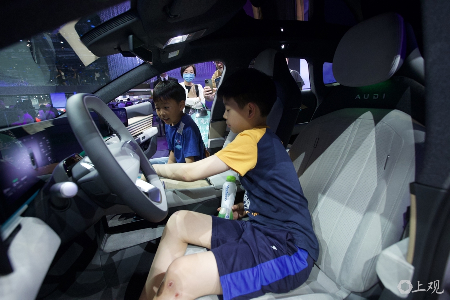 两名小朋友在展车上对智能驾驶非常感兴趣。