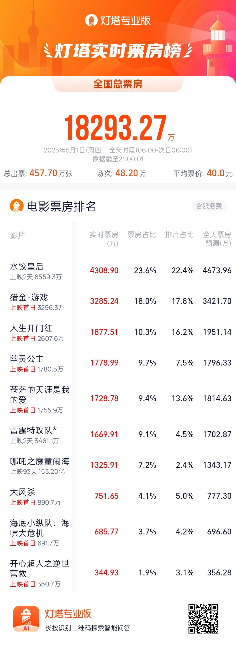 据灯塔专业版,截至5月1日21时,2025年五一档首日票房1.83亿元,影片《水饺皇后》《猎金·游戏》《人生开门红》《幽灵公主》《苍茫的天涯是我的爱》位列当日票房前五。