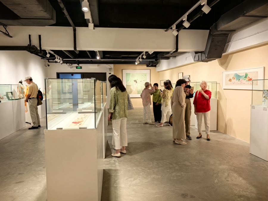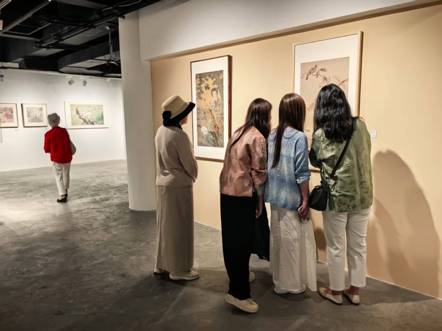 板块一“彼时·根系”,以画家万芾40年的艺术生涯为脉络,精选其30余幅经典工笔画作品,其中既有对宋元院体精微技法的承袭,亦有以现代视角解构传统的突破之作。板块二“此在·共振”还原了教学相长的真实场景,包括首次公开的课徒稿、定格师生执笔研墨专注瞬间的影像照片、50余幅学生习作等。板块三“共生·焕新”让水墨艺术突破绢纸边界,跃入日常生活,纹样服饰、日常器物等文创产品展现传统元素在当代设计中的再生与焕新。