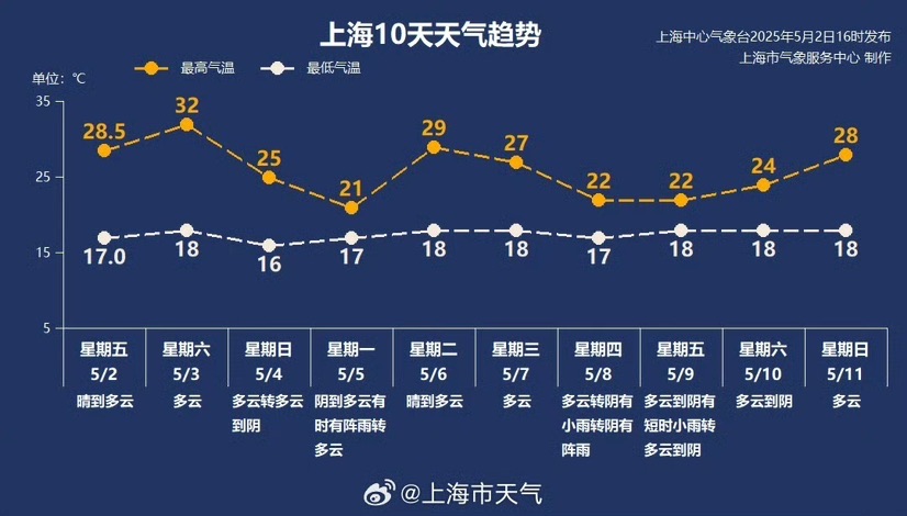 假期后两天,申城的最高气温将回落至21-25℃,短袖外面又要套上长袖外套了。5日白天,上海还将有一次降水过程,假期返程的朋友们要留意。下周工作日第一天,气温又将逼近30℃,昼夜温差重新拉大。之后上海将以多云天气为主,但在周四至周五附近还将有一次降水过程,请大家关注最新的预报信息。