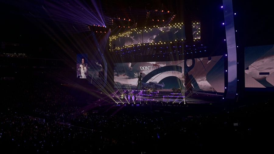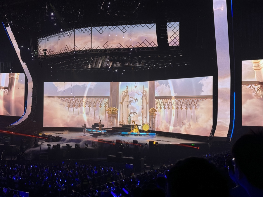 今年移师梅赛德斯-奔驰文化中心,除了延续往年的大型道具和激光、交响乐队和舞蹈表演,游戏方考虑到场地有更大的内场空间和更多吊点结构,在内场两侧和顶部架设了更多灯光设备,让观众体验被灯光“包裹”的感觉,曲面屏设计、香薰机加入,创造更加沉浸式的观演体验。