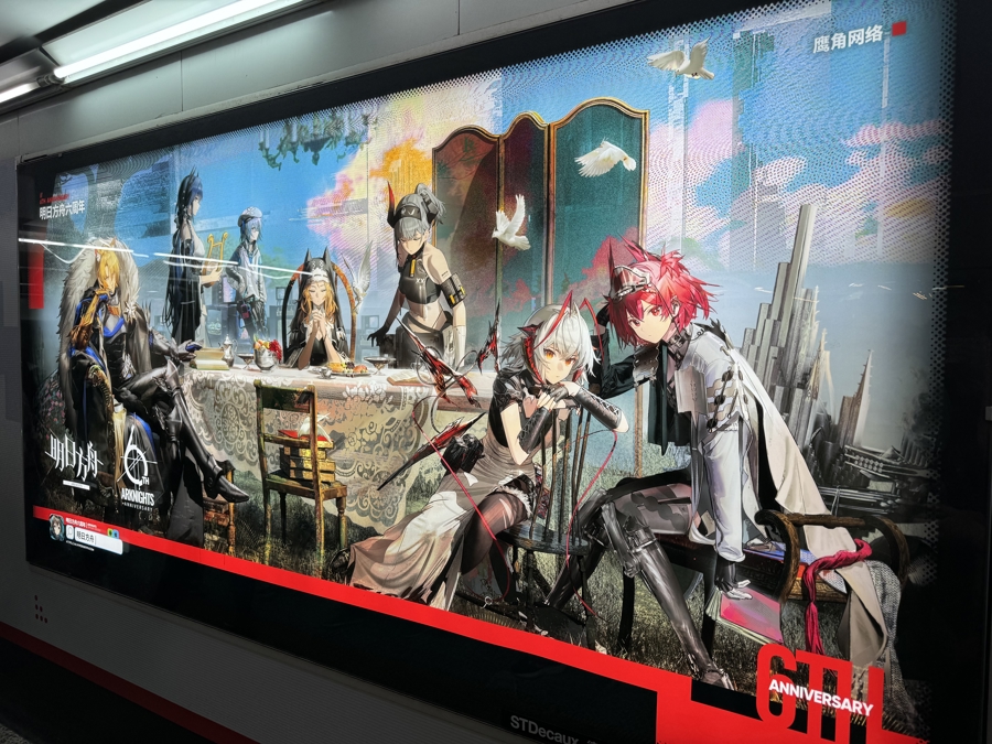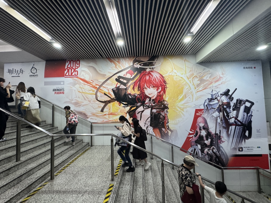 三个地铁站必去——静安寺地铁站有超大游戏墙贴和走廊大屏,活脱脱一个大型“痛站”;离梅赛德斯-奔驰文化中心最近的中华艺术宫地铁站,有与名创优品联动的展陈布置;龙耀路地铁站有大型主视觉海报,打卡完成后,就可以来到曲阜路站,到静安大悦城的明日方舟与名创优品快闪店“绒梦畅想会”买买买。