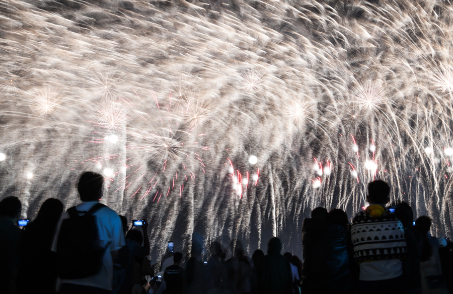 19时许,夜幕完全降临,数十道璀璨光线从一公里外的海岸线和“海上浮台”腾空而起。备受瞩目的国内合规最大规模12寸礼花弹震撼升空,绽放出直径近300米的巨型礼花,宛如盛大的流星雨自天际倾洒而下。海面、外堤、低空、中空、高空,多层次礼花瞬间点亮城市沙滩的夜空。璀璨的烟花倒映在如镜面般澄澈的海面上,光影摇曳,如梦似幻。家住附近、连续多年观看烟花秀的陈女士难掩激动:“今年的巨型礼花格外震撼!绽放瞬间仿佛点亮整个世界,让我心跳加速。虽和朋友多次观赏,但每年都有新惊喜!”