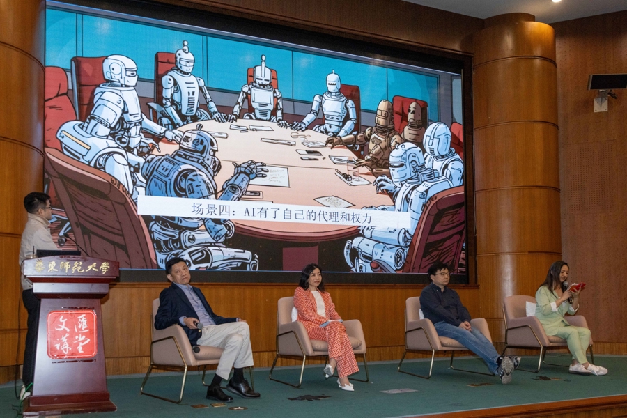 9.圆桌环节,主持人李念介绍了60位全球知名人物两天工作坊后总结出来的五种人工智能与人类关系,屏幕上播放着其中一种,AI Agent 也有了自己的代理,漫画为上报集团的澎湃新闻美术课专栏吕妍团队所绘