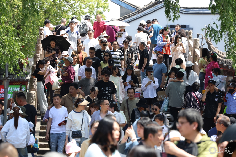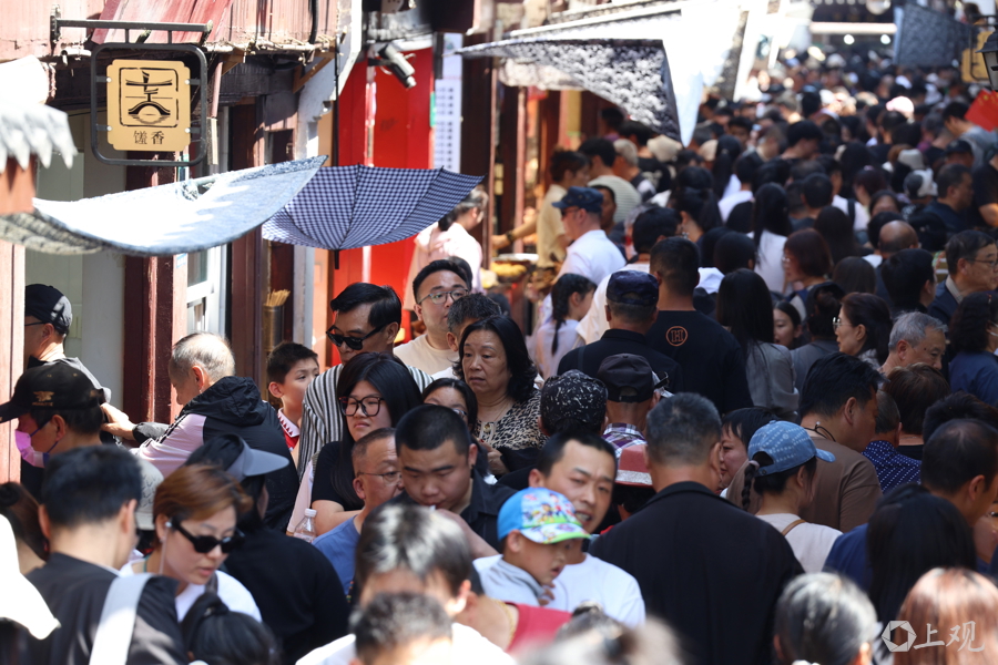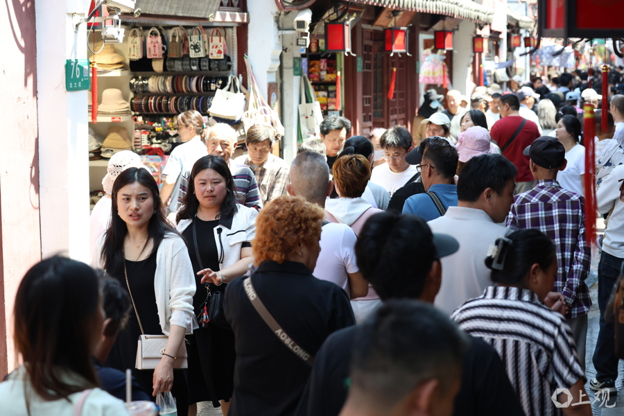 五一假期,申城各大景点游客云集。七宝古镇一大早便迎来超大人流,直至夜晚到处都是人头攒动的热闹景象,沿街商户忙得不亦乐乎。