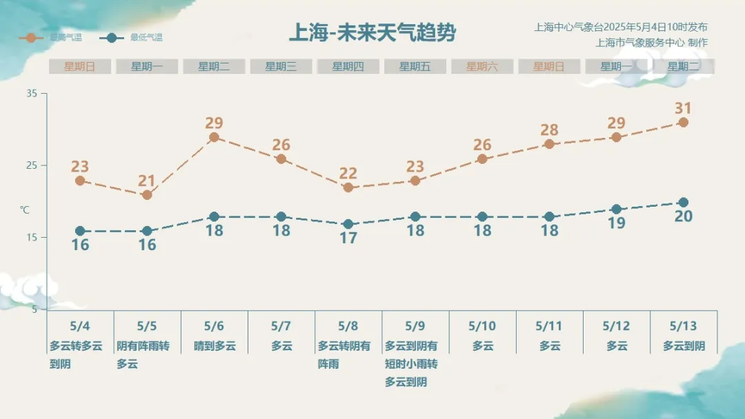 小长假过后,申城将迎来两天晴或多云的天气,最高气温再次回升至27~30℃。8日前后还将有一次降水过程,并伴有降温和大风。