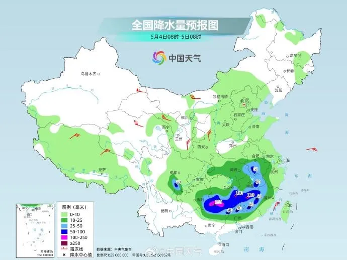 预计,5月4日14时至5日14时,贵州东南部、广西东北部、广东北部、湖南中南部、江西南部和东部、福建西部、安徽南部、湖北东部、浙江西部和东北部、上海、四川盆地西南部等地部分地区有大到暴雨,其中,江西东南部、福建西部、贵州东南部、湖南西南部、广西东北部等地部分地区有大暴雨(100~140毫米)。