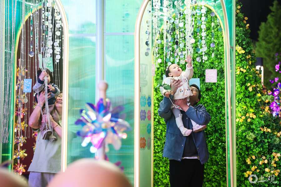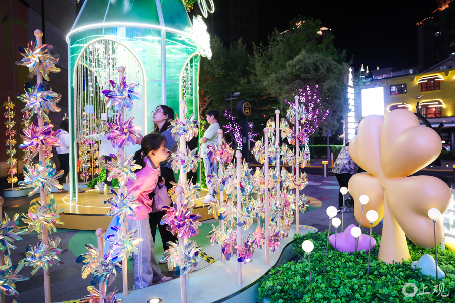 千枚风车矩阵与光影瀑布交相辉映,巨型幸运草许愿瓶装置吸引消费者打卡留念。