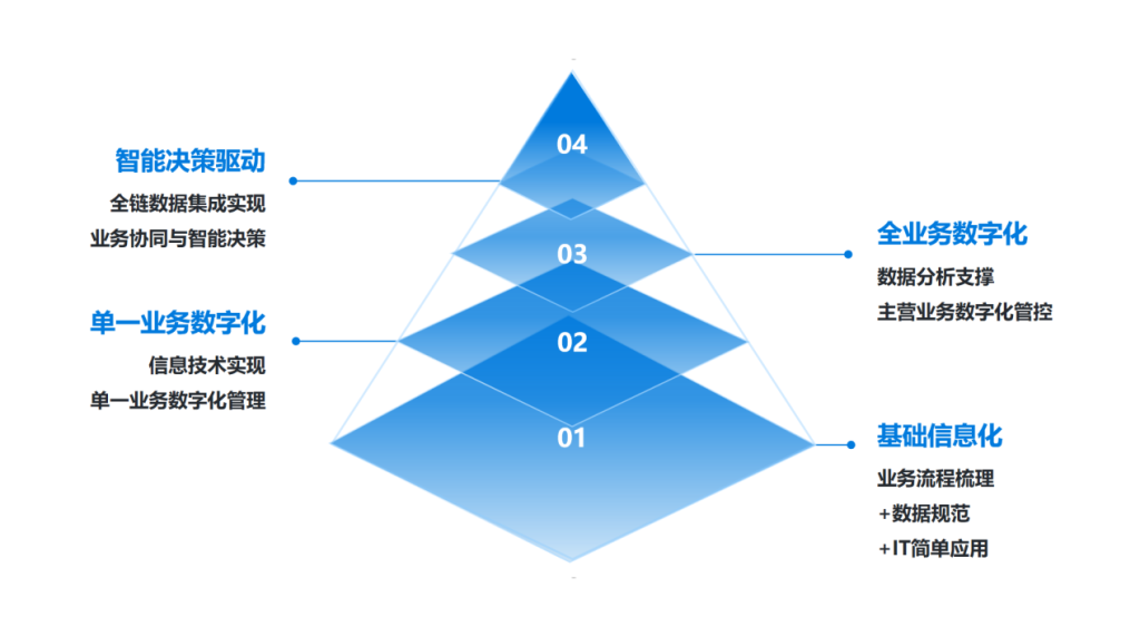 当前,工信部将企业的数字化转型划分为四个层级,见图1。其中,一级与二级为信息化阶段,聚焦于通过信息系统改进日常管理;三级和四级才是真正意义上的数字化转型——通过大数据、人工智能、云计算、物联网等技术,实现业务流程的重构与价值创造的跃迁。