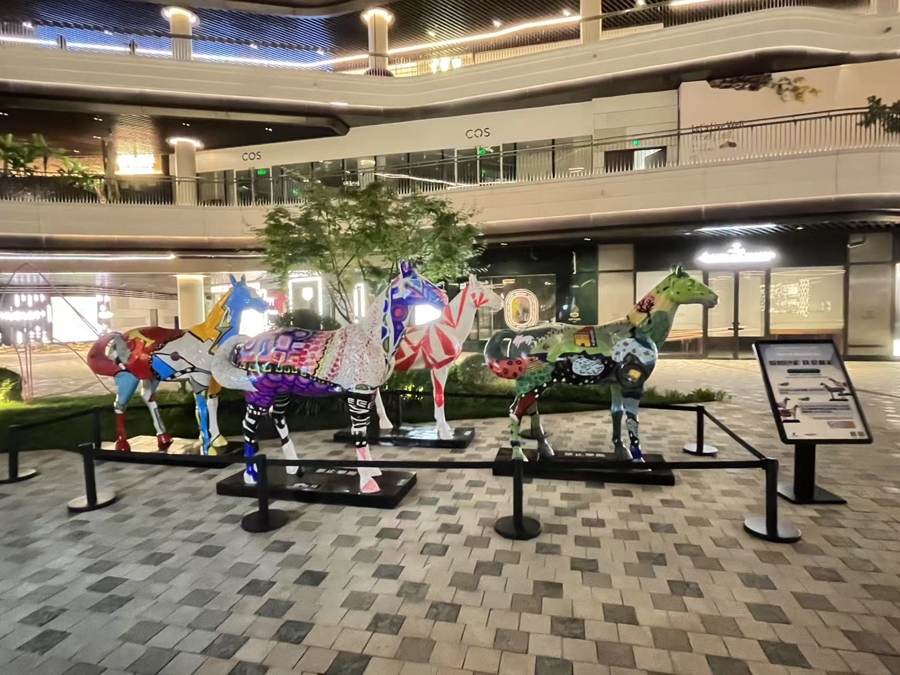 4月27日至5月5日期间,为响应2025上海浪琴环球马术冠军赛的赛事热点,前滩太古里携手赛事方于石区L1外广场限时呈现“骑妙色彩·跃见精彩”装置会,4匹跃动的彩绘骏马装置以几何色块重构马术运动动态美学,诠释了赛事优雅与力量的精神内核,呈现一场跃动姿态与缤纷色彩的交融。