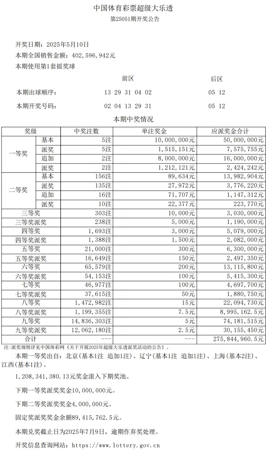 5月10日,超级大乐透8.8亿派奖第14期25051期开奖。前区开出号码02、04、13、29、31;后区开出号码05、12。本期全国销售4.02亿元,为国家筹集彩票公益金1.44亿元。