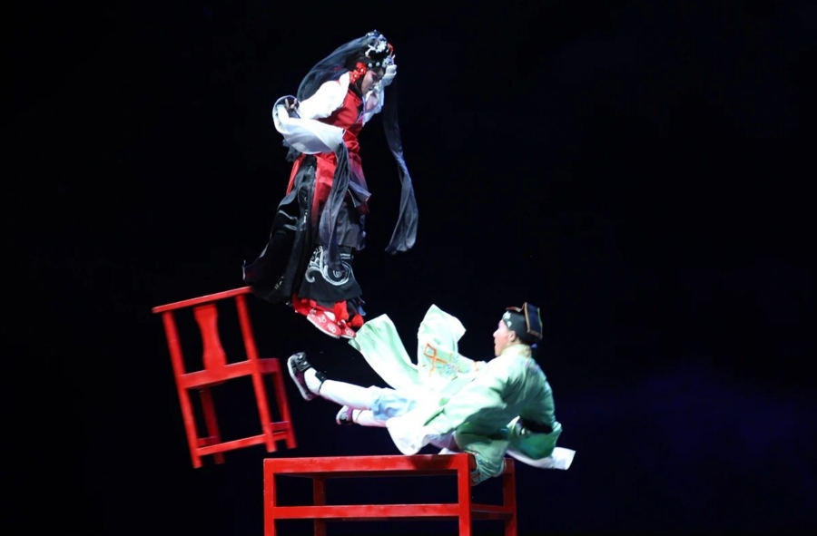 梅花奖终评预热阶段,鲍陈热在几场快闪和导赏中演示了《阎婆惜·活捉三郎》桌上踹凳的惊人一跳,事实上,《活捉三郎》这出折子戏特别生动地呈现了台州乱弹如何博采众长又独树一帜。《活捉三郎》是“水浒戏”中一折,在京昆等各大剧种里都是常演剧目。阎惜姣死于宋江刀下,变作厉鬼,索命情夫张文远,舞台上的旦角既是艳鬼又是厉鬼,女演员的鬼步和水袖动作技术难度高,可看性强,既有风情万种的艳丽,又凶狠凄厉,使人胆寒。台州乱弹的《活捉三郎》大致沿用了昆剧的框架,鲍陈热也曾向昆剧名家梁谷音学习。在昆剧程式已经相当完整的前提下,台州乱弹很明显向民间观赏趣味倾斜,充分利用一桌二椅,加入几组高难度的跳跃和造型,不仅场面火爆,也让整个折子的表演节奏感更突出了。