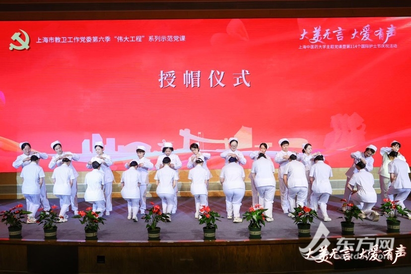 东方网记者刘轶琳5月14日报道:今天下午,上海市教卫工作党委第六季“伟大工程”系列示范党课之上海中医药大学“大美无言 大爱有声”主题党课暨第114个国际护士节庆祝大会在该校举行。主题党课聚焦大力弘扬和践行新时代医疗卫生职业精神,采用情景剧、主题演讲、微视频、朗诵等多种形式,全景式呈现了上中医护理人传承红色基因、践行医者使命的动人篇章,结合国际护士节庆祝活动,激励学校系统护理人员勇于担当,创新发展,为健康中国贡献更多的智慧和力量。