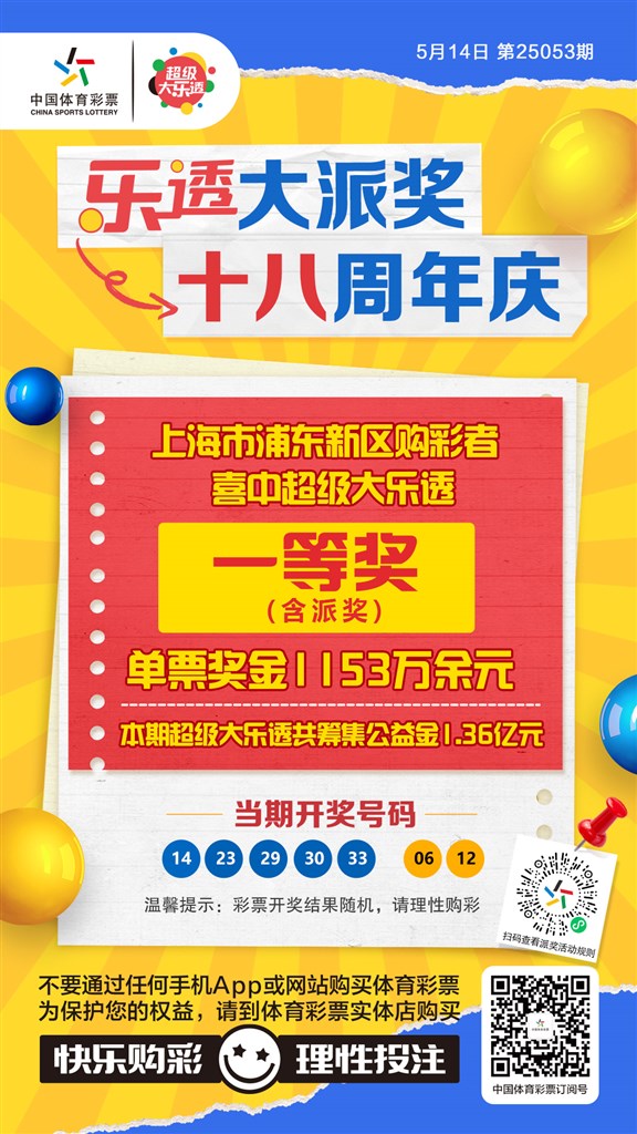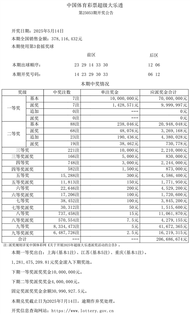 5月14日,超级大乐透8.8亿派奖第16期25053期开奖。前区开出号码14、23、29、30、33;后区开出号码06、12。本期全国销售金额为378,116,432元,为国家筹集彩票公益金1.36亿元。