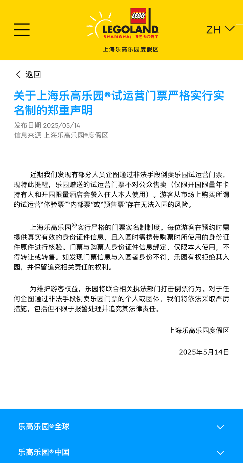 上海乐高乐园度假区官网5月14日发布了《关于上海乐高乐园试运营门票严格实行实名制的郑重声明》。上海乐高乐园度假区官网截图