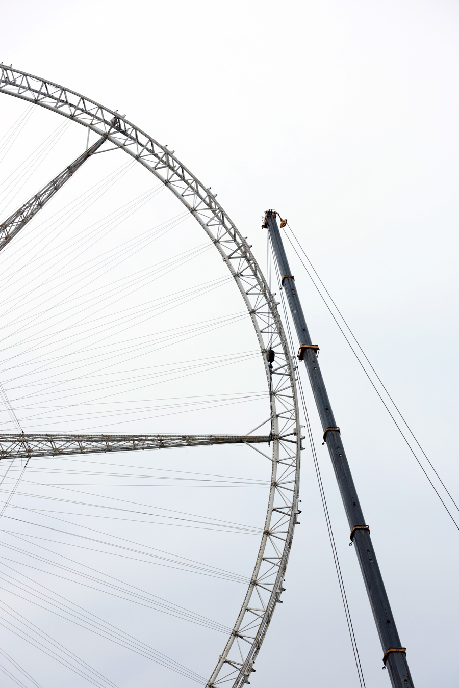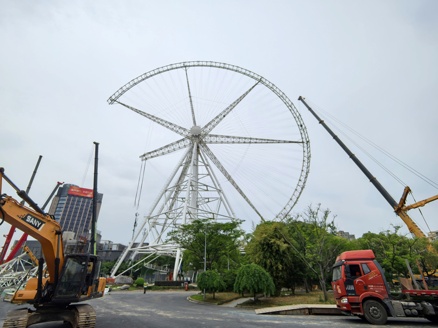 2025年5月15日,锦江乐园摩天轮开启拆除,现场4台吊车组合作业,轿厢已卸下,钢筋及圆周固件也正在陆续拆除中。