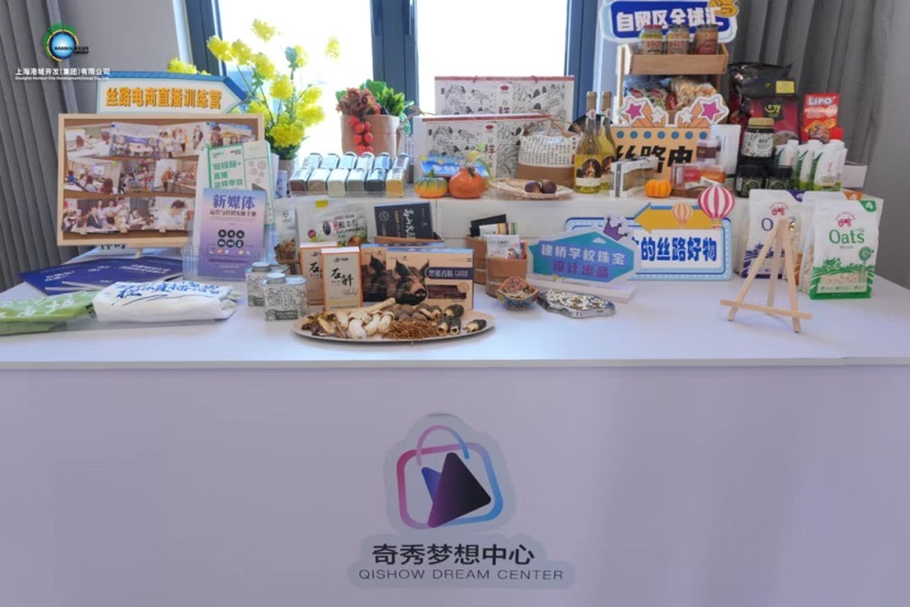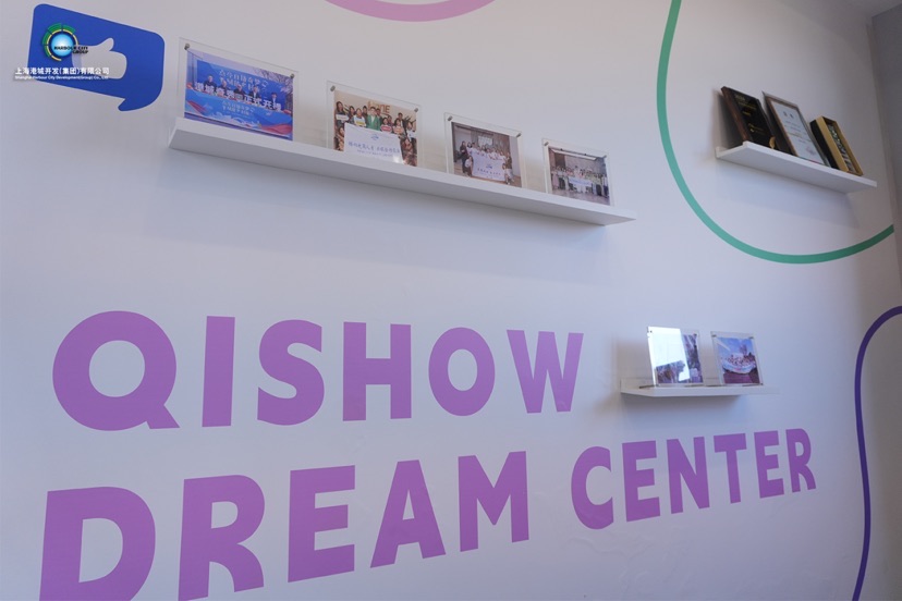 侧面的墙上,不同的照片和授牌错落着讲述“港城·奇秀梦想中心”的故事:作为校企实习实训基地、万祥镇青年中心、“丝路电商”合作研修中心,曾举办“童眼”看乡村振兴亲子研学活动、万祥镇丝路电商直播训练营等多彩活动,荣获“浦东国际商会2024企业高质量发展生态共建单位”“市共青团2024年度青年夜校服务青年发展计划入库课程”“万祥镇经济杰出贡献奖”等荣誉。