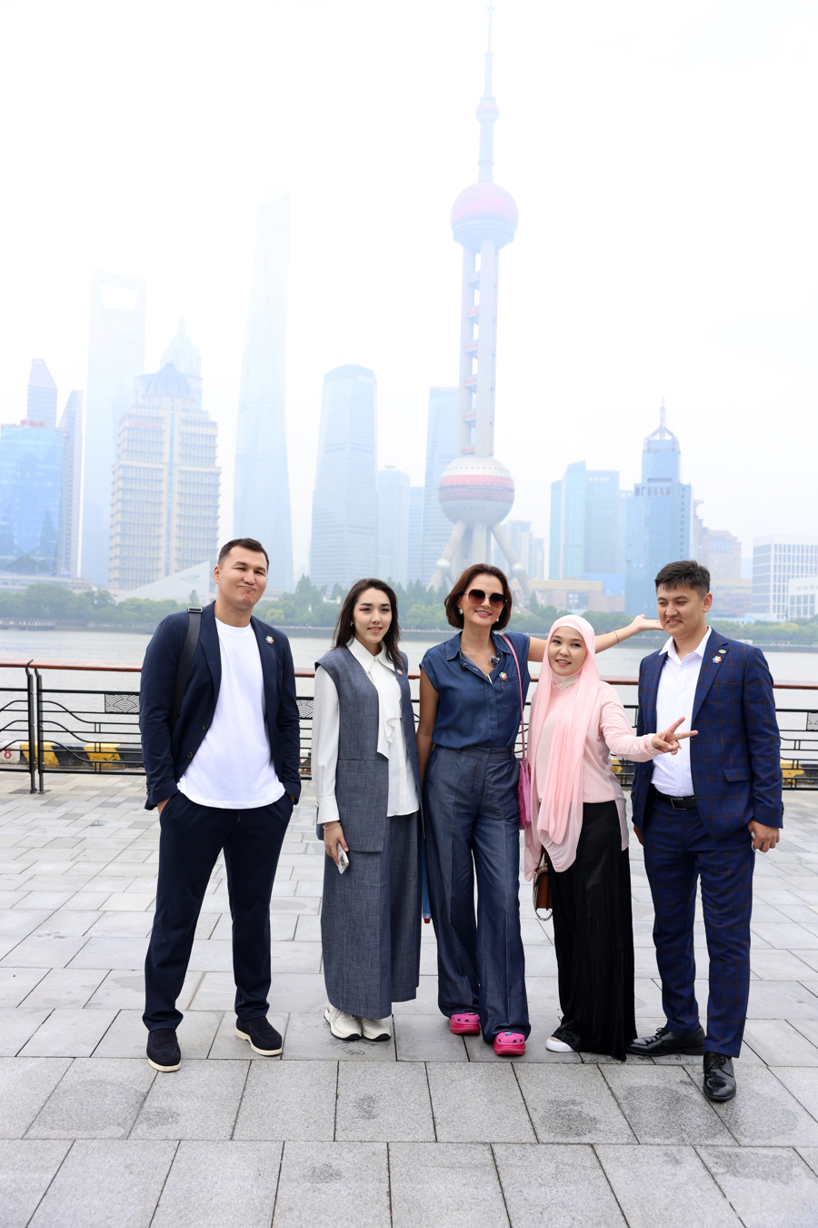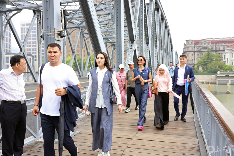 Aktoty Nurkeshova一行打卡外白渡桥,随即通过苏州河黄浦江亲水平台走向外滩。