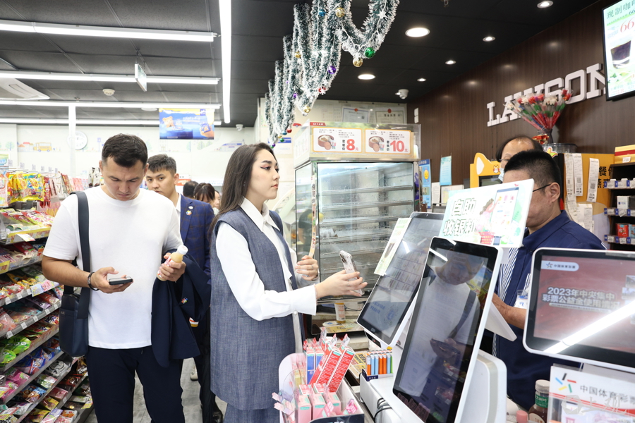 行走一小时后,Aktoty Nurkeshova一行口渴,随即进入一家罗森便利店。小店丰富的饮料品种让他们惊叹,使用Alipay扫码支付也很便捷。经过筛选比对,他们多数人更喜欢鲜榨果汁饮品。
