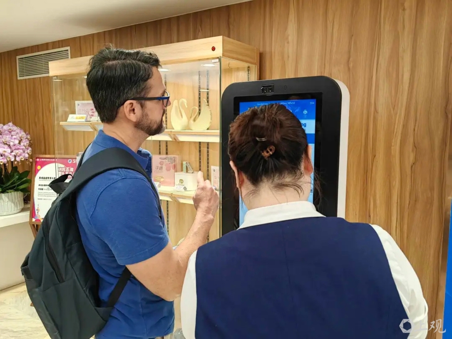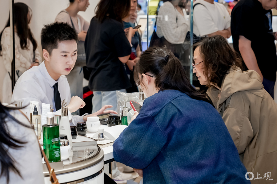 此次店庆还吸引了不少外国游客前来“血拼”。巴西游客在资生堂柜台为太太选购了一套化妆品。“过几天就是她的生日了,这是她喜欢的品牌,这里的价格比我们当地低了30%,太划算了。”他高兴地说。便捷的离境退税服务更是让他赞不绝口。在上海首台自助退税单开具机前,他输入入境时间、手机号码,扫描退税发票等,不到2分钟就完成了操作。