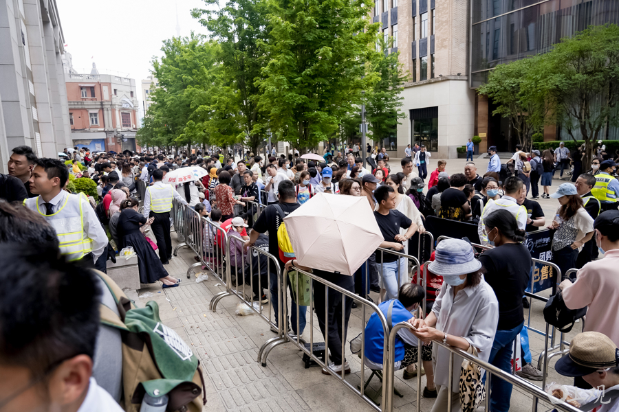 今天的南京路商圈也很热闹。这个周末(5月17-18日),新世界大丸百货启动十周年店庆,推出全年最大力度赠券活动。今天凌晨1时,新世界大丸百货门口已经有几十人在排队,早上7时30分,长队蜿蜒了大丸百货一圈。