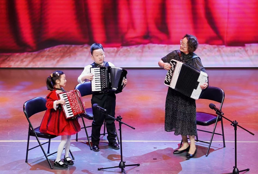 获得“最佳风采奖”的手风琴重奏《大阅兵》,由外婆黄慧英带着孙辈张星玥、张辰阳完成。热爱音乐的黄慧英退休后,拿起手风琴开始学习。龙凤双胞胎张辰阳、张星玥从小听着外婆悠扬的琴声长大,也对手风琴产生了兴趣,从上幼儿园大班起开始跟着外婆到市民驿站手风琴团队学习。平日里,祖孙三人常围坐在一起演奏,琴声伴着欢笑,音符传递温情,家中洋溢着幸福与欢乐。