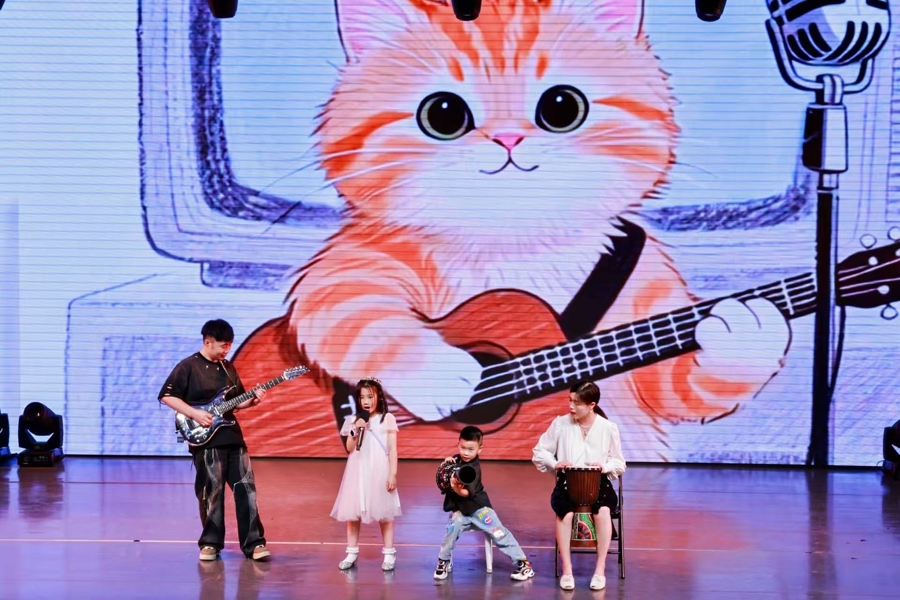 获得“最佳才艺奖”的吉他弹唱《快乐星猫》,由“佟心协力”家庭上演。这场演出由经营音乐培训品牌的父母,带着两名子女共同演绎。在舞台上,妈妈黄灵敏带着幼子佟安吉打着鼓,爸爸佟立亮弹着吉他、女儿佟安琪唱着歌。整场演出轻松、灵动,其乐融融,让观众真切感受到“全家玩音乐”的动情场面。“孩子们在旋律中成长,我们在音符间传递爱与欢乐,音乐让平凡的日子变得生动有趣。”黄灵敏说。