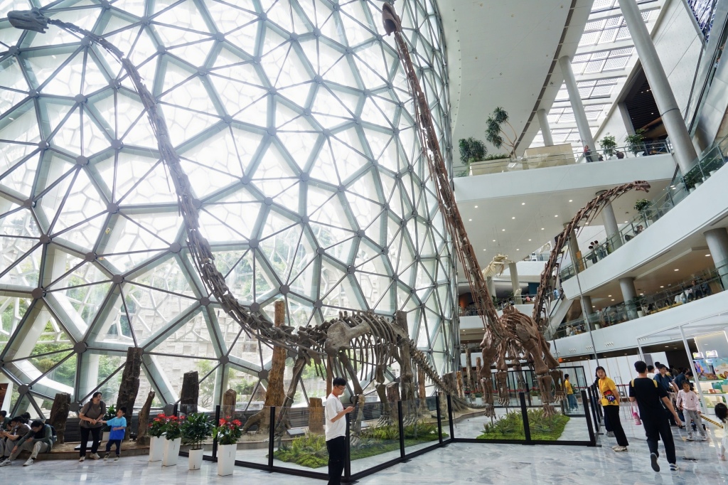 事实上,有三个“庞然大物”早在今年“五一”期间就占据了上海自然博物馆的B2中庭。它们是来自河南自然博物馆的巨型汝阳龙,装架体长达38.1米,是迄今发现的世界上体型最大的恐龙之一。来自自贡恐龙博物馆的合川马门溪龙,体长22米,仅脖子就占了一半,是巨型蜥脚类恐龙中的老牌巨龙,曾长期霸占“亚洲第一龙”的宝座。还有同样来自自贡恐龙博物馆的天府峨眉龙,体长达到20米,是侏罗纪中期蜥脚类恐龙巨型化发展的重要代表。