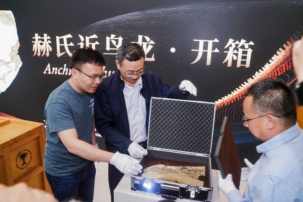 在中国恐龙大展开箱仪式上,赫氏近鸟龙、长臂浑元龙和三叠中国龙三件珍贵恐龙标本开箱亮相。