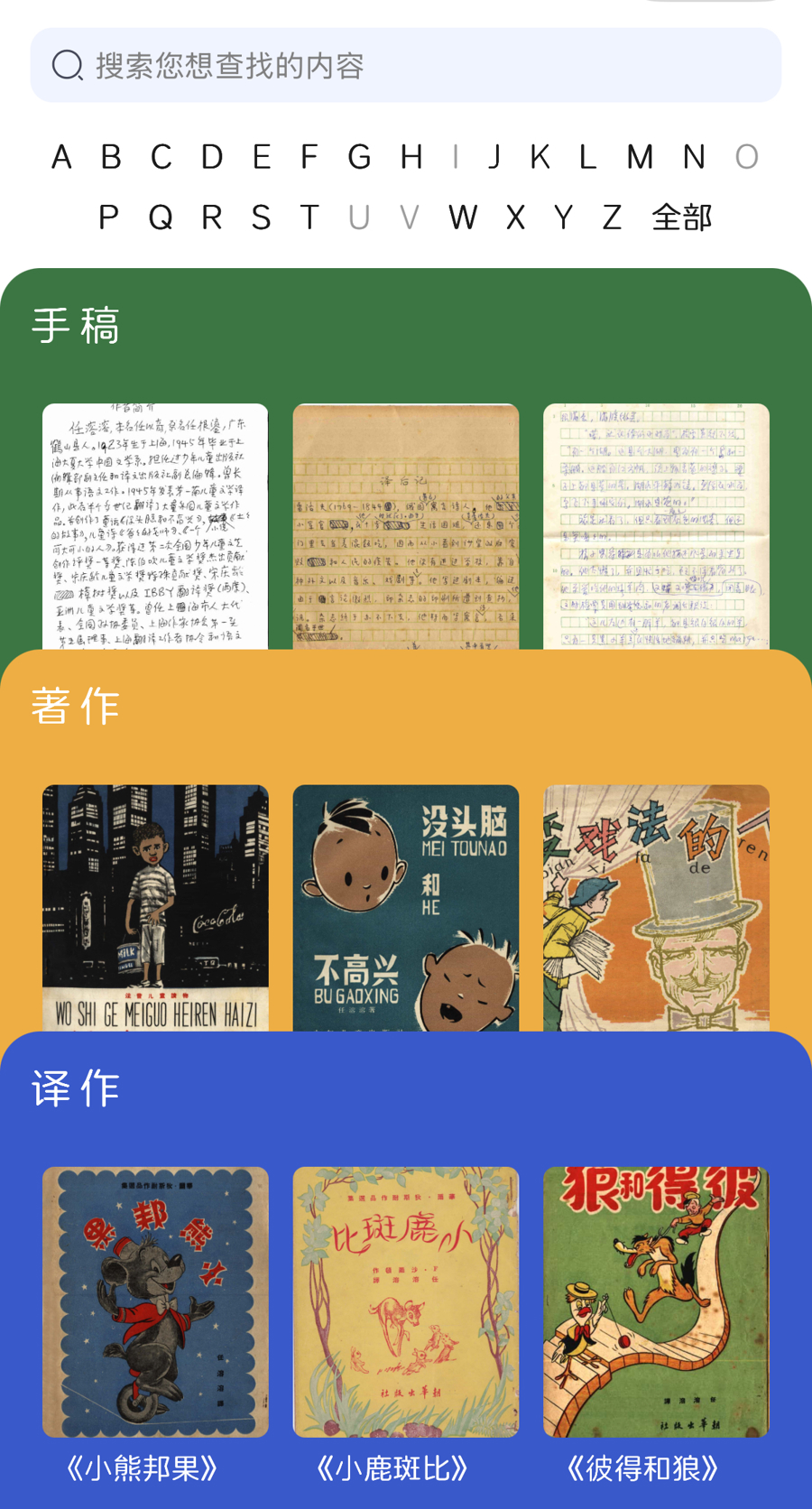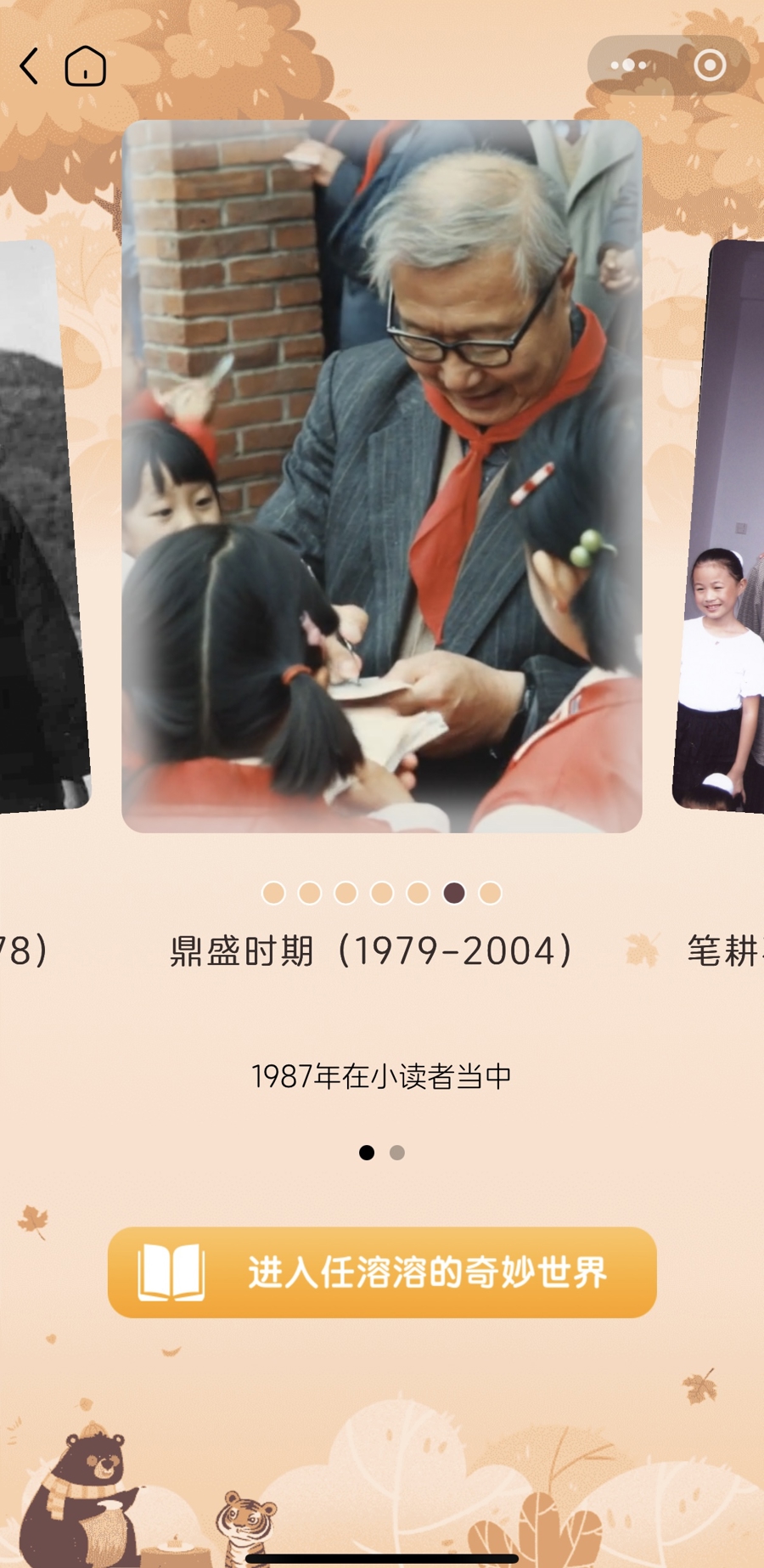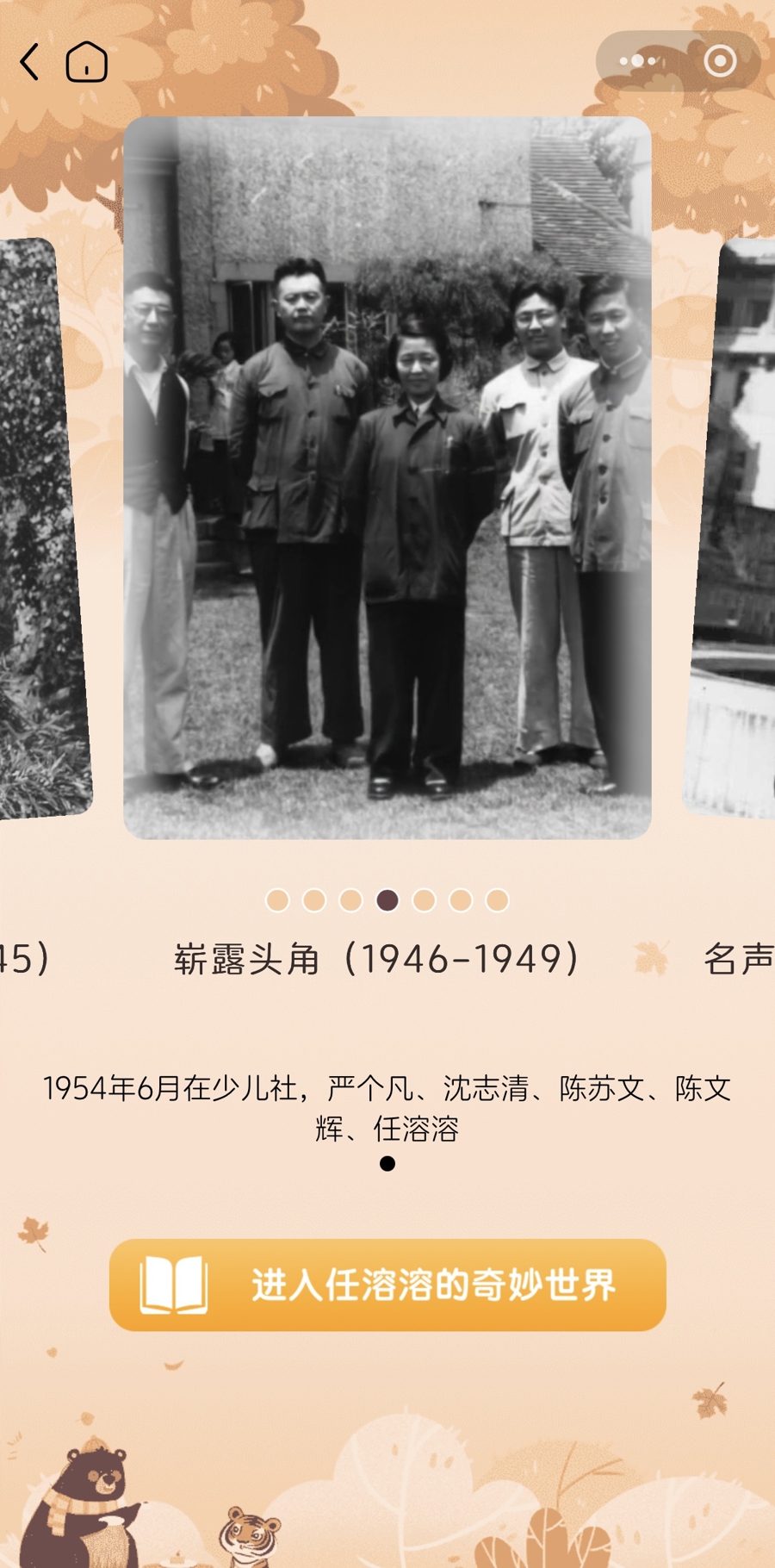 这一点,在先期上线的“任溶溶数字图书馆”的设计构架上可见一斑。搜索“遇见任溶溶”小程序,首先映入眼帘的是漫画家、被称为上海美影厂“三剑客”之一的詹同为任溶溶绘制的人物形象,生动活泼。首页小图标及小程序各板块中的插画均出自任溶溶之子任荣炼之手。这些饱含深情的创作让这个“数字图书馆”既温馨又独具特色,五个特色板块共同展现了任溶溶丰富多彩的文学人生。
