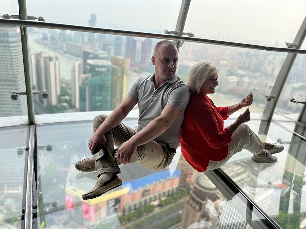 5月18日,Galina Predtechenskaia和丈夫在东方明珠玻璃步道上合影。 澎湃新闻记者 邹娟 摄