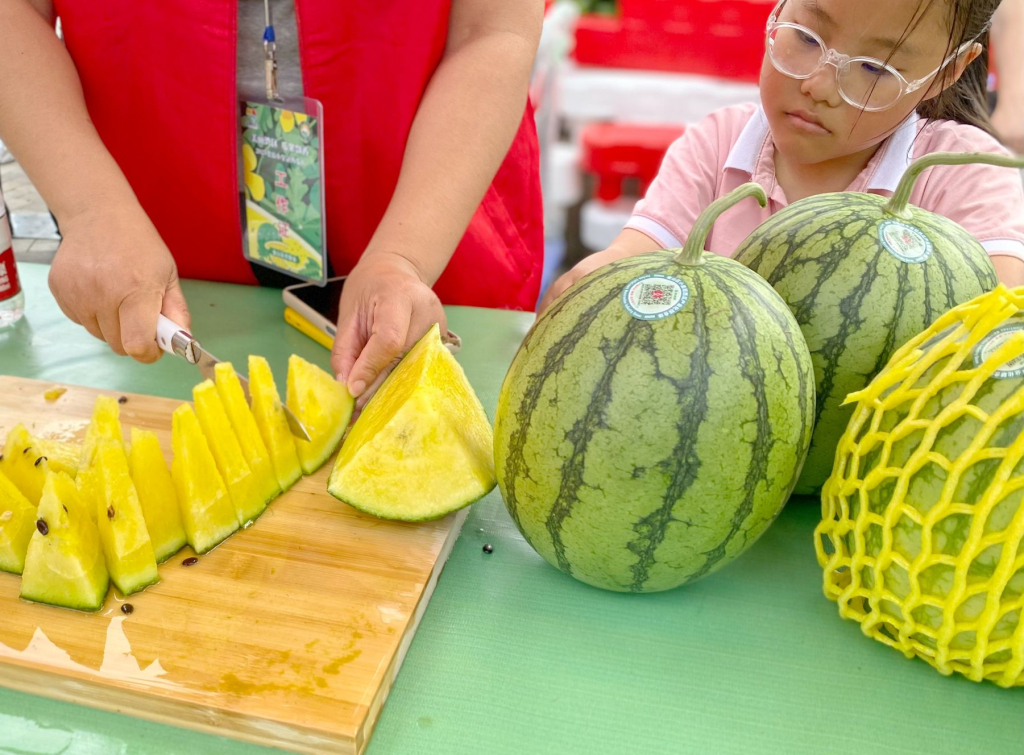 家长带着孩子品尝今年刚上市的金山“小皇冠”西瓜。