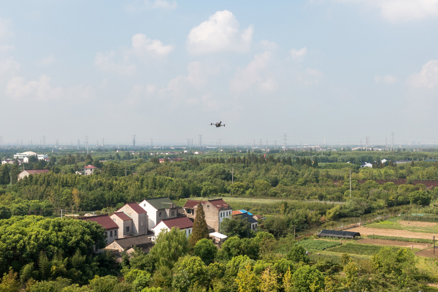 在上海奉贤区南桥镇江海村的田间地头,村民们时常能看到一名身着黑色工装、操控着无人机反复测试的男子。在他的遥控下,无人机或沿着河道林地低空飞行,或装载着食品、包裹往返运输于村域内,或在高空对房屋进行外墙清洁,新奇的玩法让村民惊叹不已。