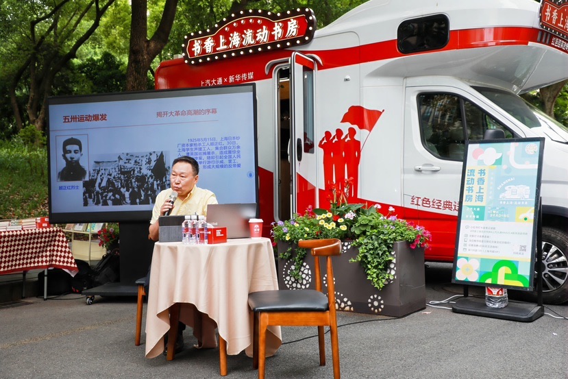 3:30,“新青年读书荟”特邀五卅运动烈士糜文浩的侄孙糜强先生,带来“弄潮儿——五卅运动前后的糜文浩”专题讲座。通过家族记忆与珍贵史料,观众们深入了解了革命先烈的英勇事迹,无不为之动容。 暮色传承:月光下的初心回响 夜幕降临,中共一大纪念馆延长开放至20:00,夜场活动同样精彩。中共一大会址正门限时开放,供观众瞻仰打卡;卢湾一中心小学的“红喇叭”小讲解员们用稚嫩而坚定的声音,为观众讲述党的初心故事,赢得阵阵掌声。