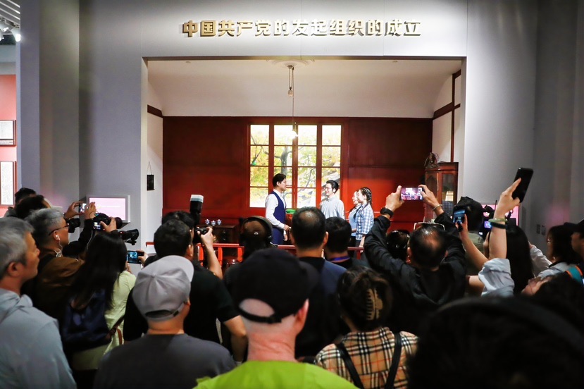 9:15,原创情景党课《破晓》在老渔阳里二号展区上演。四位青年讲解员身着年代服饰,化身百年前的革命先驱,生动演绎“南陈北李,相约建党”的历史场景。观众们屏息凝神,仿佛穿越时空,置身于那段风云激荡的岁月。“历史人物一下子鲜活了起来,这种形式让人印象深刻。”一位学生观众感慨道。 正午鎏金:多维体验传递红色力量 中午时分,“热的血——纪念五卅运动100周年文物史料专题展”成为焦点。展览通过历史照片、文献和实物,结合AI老照片复原、互动问答等现代技术,生动再现了1925年中国共产党领导的五卅运动。一位家长表示:“孩子们通过场景复原和互动体验,对这段历史有了更直观的理解。”
