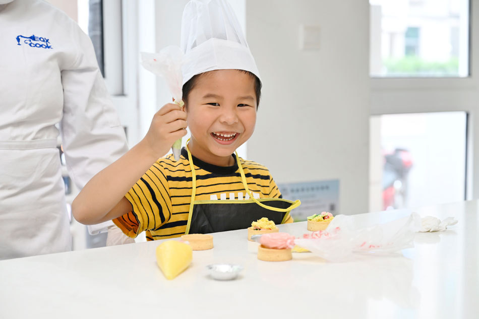 在上海市第二轻工业学校,孩子们在体验“我的时尚甜品塔”项目。