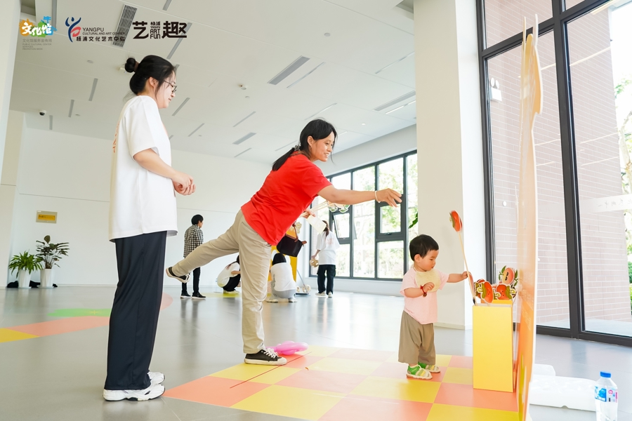 立体装置的旁边,杨浦“艺趣文化生活季”品牌吉祥物“橙双双”“柿好好”以可爱的形象,吸引着市民前来合影打卡。“橙心橙意”游园会正在这里举行。游园活动通过游戏点位、社交打卡、集章兑礼等多样化参与模式,满足各年龄段群体需求。游戏点位将传统文化与创意游戏紧密结合,投壶、抖空竹等民俗体验活动,让市民在欢乐中感受文化传承的温度。一位市民惊喜地表示:“既学习了历史典故,又体验了民俗传统,杨浦文化艺术中心真是家门口的‘宝藏课堂’。”