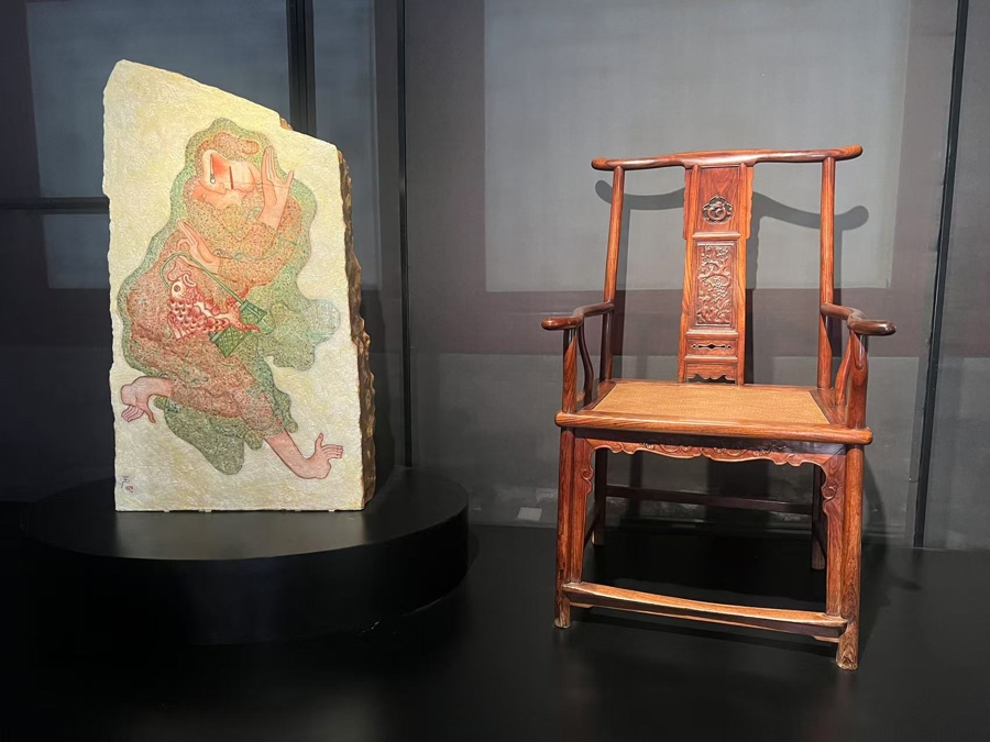 明代黄花梨攒靠背禅椅(右)和现代陶艺作品《鱼篮观音》(左)