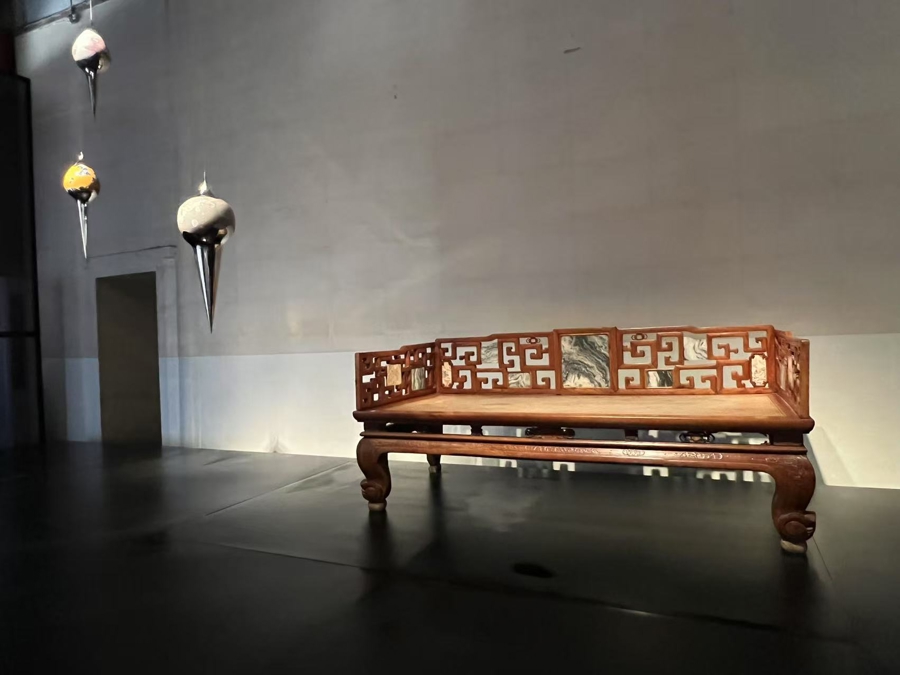 清代的榉木罗汉床与悬吊的现代陶艺作品