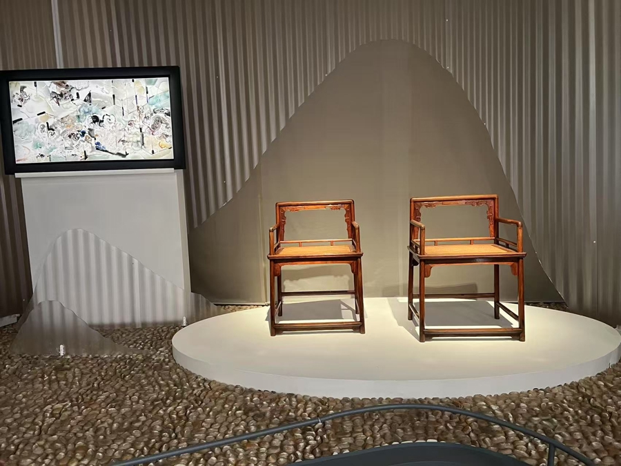 明代黄花梨玫瑰椅(右)和现代陶艺作品《屏风·引山水入园林》(左)