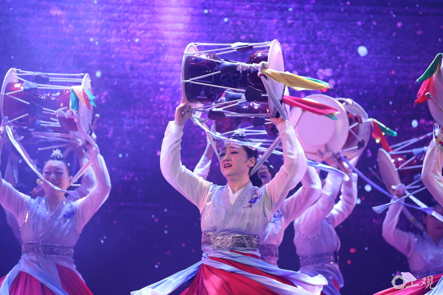 闵行区虹桥镇社区文化活动中心美阿里舞蹈队的舞者们身着色彩鲜艳的朝鲜族民族服饰,背着长鼓,一边跳舞一边击打着鼓面,节奏明快有力,最后以飞速旋转结束了高难度的朝鲜舞《鼓秀春色》……